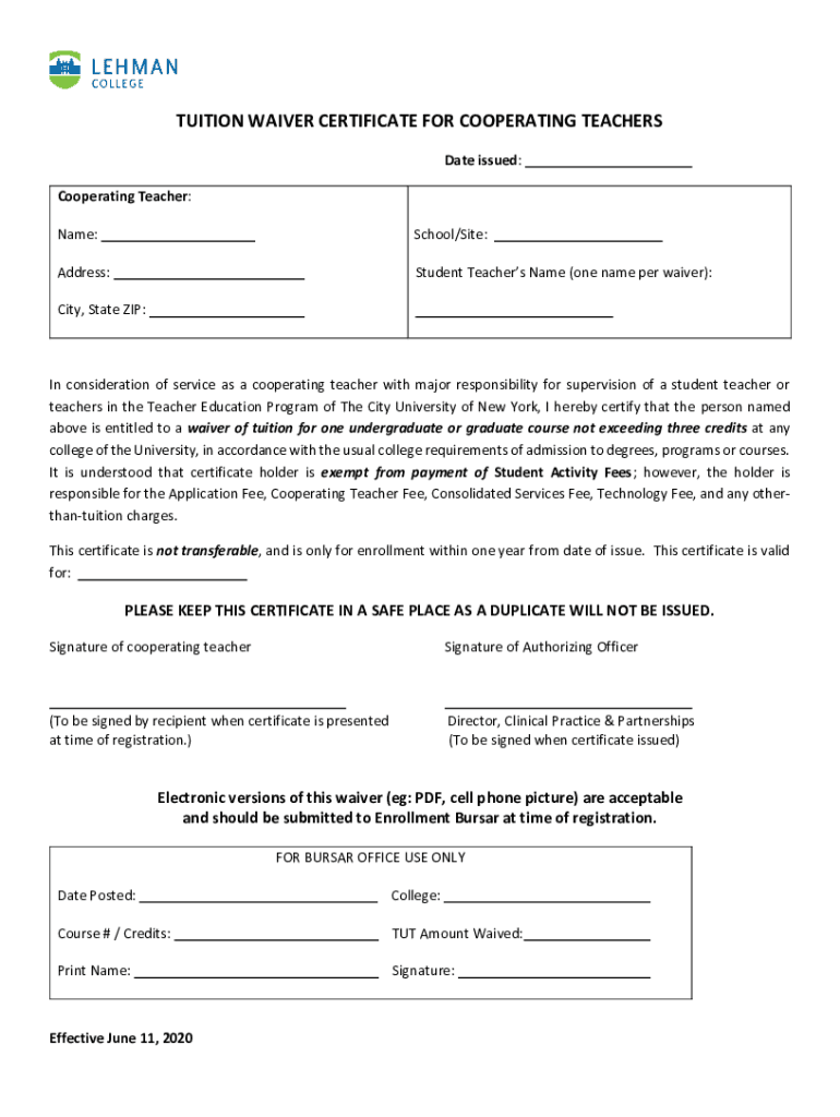 TUITION WAIVER CERTIFICATE FOR COOPERATING TEACHERS Date issued: Cooperating Teacher: Name:School/Site:Address:Student Teachers Name (one name per waiver):City, State ZIP:In consideration of service