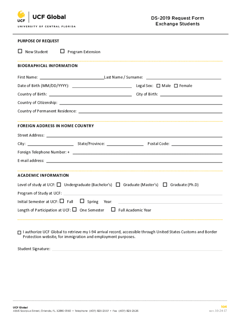 DS2019 Request Form Exchange Students PURPOSE OF Requested StudentProgram ExtensionBIOGRAPHICAL INFORMATION First Name:Last Name / Surname: Date of Birth (MM/DD/YYY): Legal Sex:Country of Birth:City