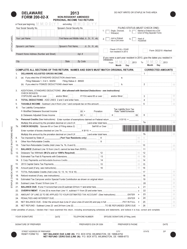 DELAWARE FORM 200-02-X 2013 NON-RESIDENT AMENDED PERSONAL INCOME TAX RETURN or Fiscal year beginning Print Form Reset and ending Your Social Security No. ATTACH LABEL DO NOT WRITE OR STAPLE IN THIS