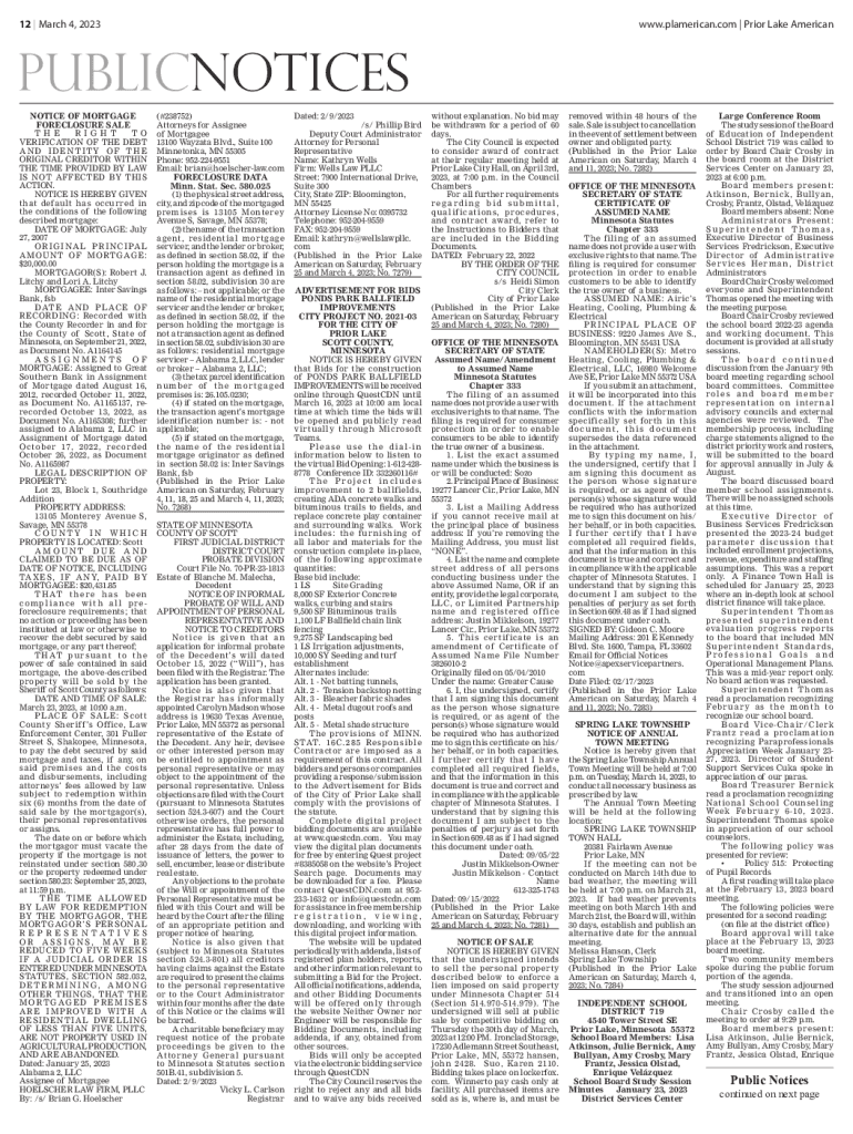 12 | March 4, 2023www.plamerican.com | Prior Lake Americanpublicnotices NOTICE OF MORTGAGE FORECLOSURE SALE T H E R I G H T T O VERIFICATION OF THE DEBT AND IDENTITY OF THE ORIGINAL CREDITOR WITHIN