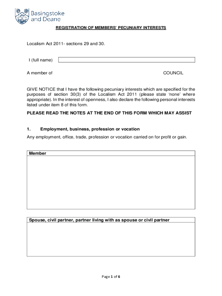 REGISTRATION OF MEMBERS PECUNIARY INTERESTSLocalism Act 2011 sections 29 and 30. I (full name)