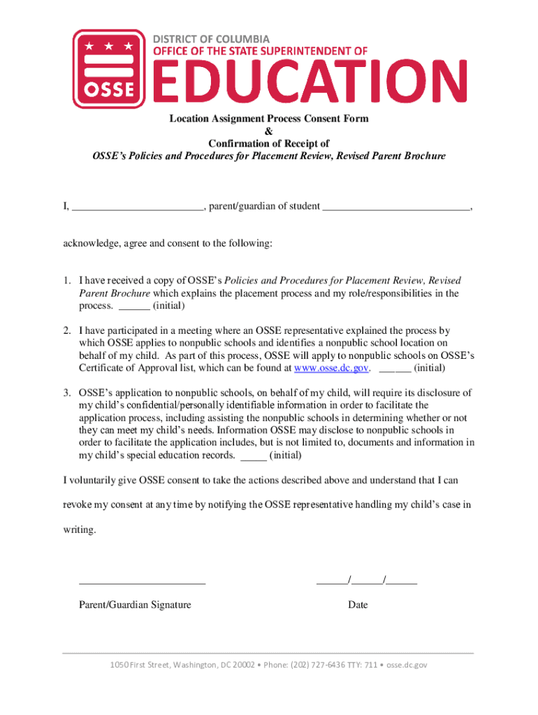 Location Assignment Process Consent Form & Confirmation of Receipt of Losses Policies and Procedures for Placement Review, Revised Parent Brochure, ___, parent/guardian of student ___, acknowledge,