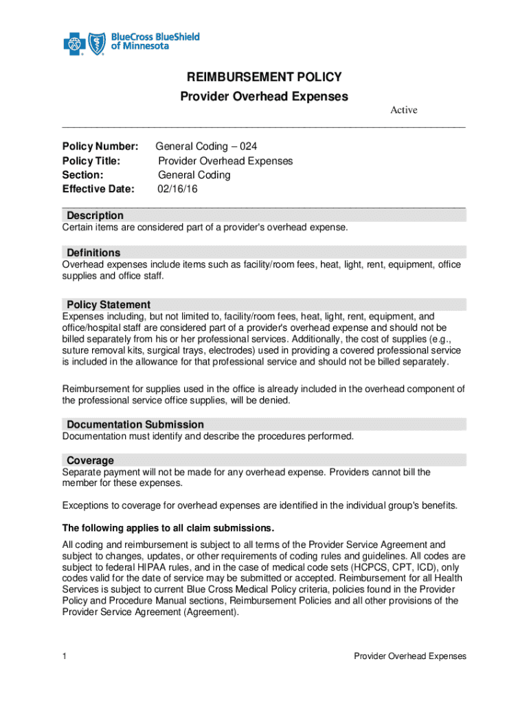 REIMBURSEMENT POLICY Provider Overhead Expenses Active ___ Policy Number: General Coding 024 Policy Title: Provider Overhead Expenses Section: General Coding Effective Date: 02/16/16 ___ Description