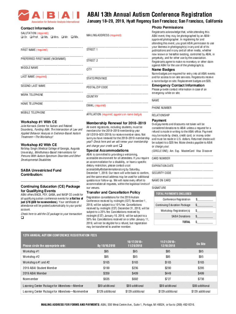AAI 13th Annual Autism Conference Registration January 1820, 2019, Hyatt Regency San Francisco; San Francisco, California Photo PermissionsContact Information SALUTATION (required): Dr. Prof. Ms.