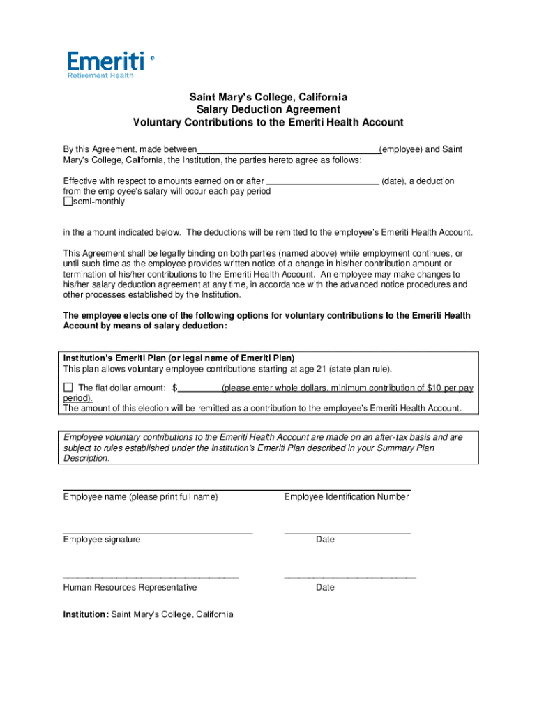 Saint Mary's College, California Salary Deduction Agreement Voluntary Contributions to the Emerita Health Account By this Agreement, made between Mary's College, California, the Institution, the parties