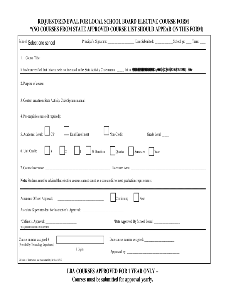 REQUEST/RENEWAL FOR LOCAL SCHOOL BOARD ELECTIVE COURSE FORM *(NO COURSES FROM STATE APPROVED COURSE LIST SHOULD APPEAR ON THIS FORM) School1. Principals Signature: ___ Date Submitted: ___School yr: