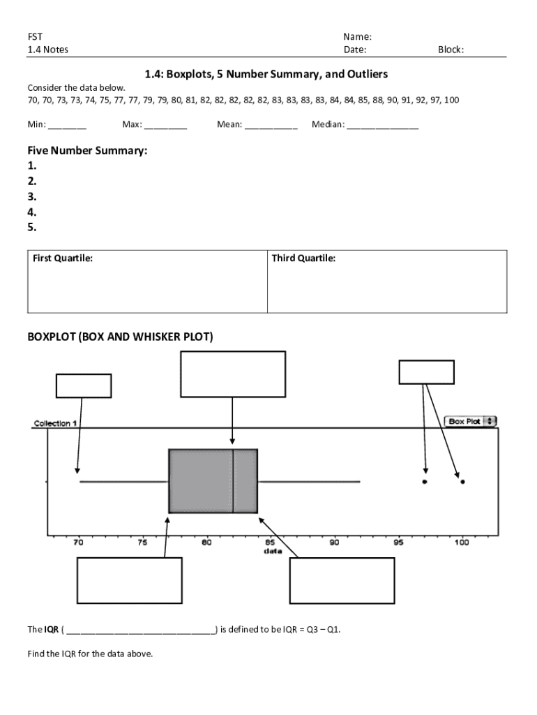 FST 1.4 Forename: Date:Block:1.4: Box plots, 5 Number Summary, and Outliers Consider the data below. 70, 70, 73, 73, 74, 75, 77, 77, 79, 79, 80, 81, 82, 82, 82, 82, 82, 83, 83, 83, 83, 84, 84, 85,
