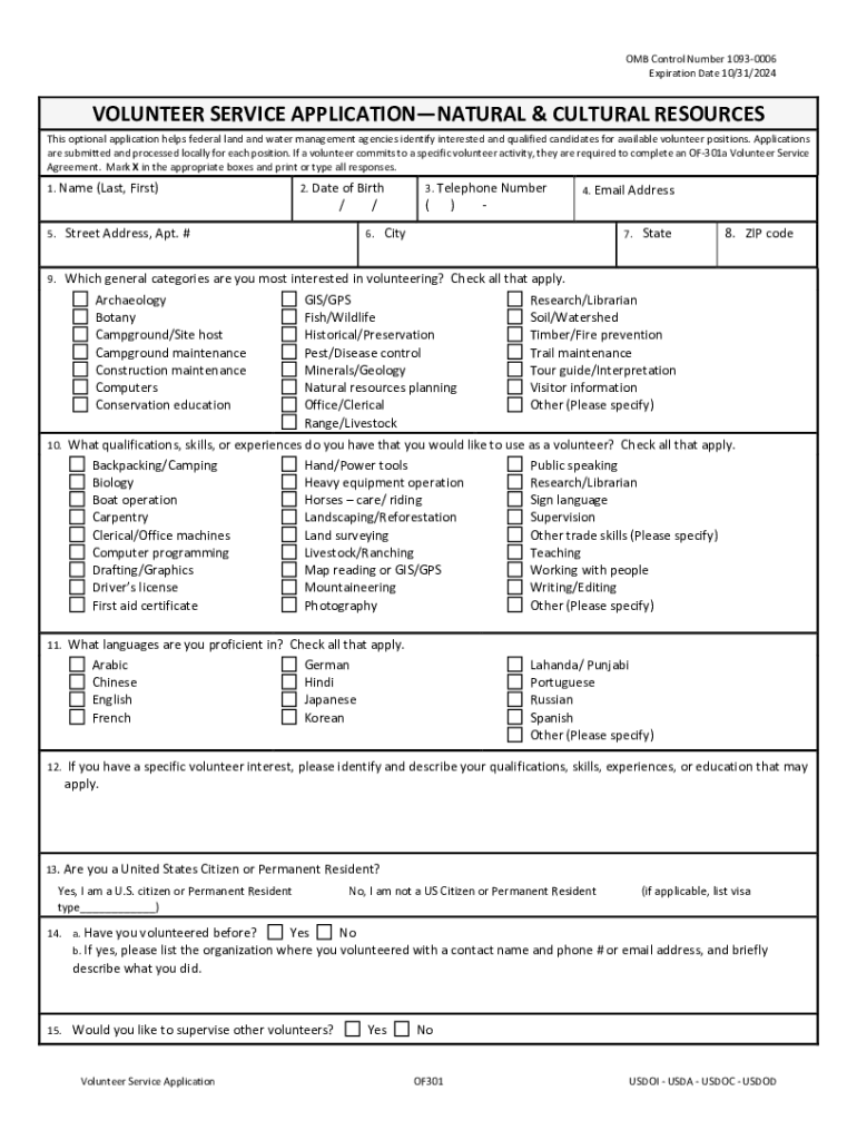 OMB Control Number 10930006 Expiration Date 10/31/2024VOLUNTEER SERVICE APPLICATIONNATURAL & CULTURAL RESOURCES This optional application helps federal land and water management agencies identify