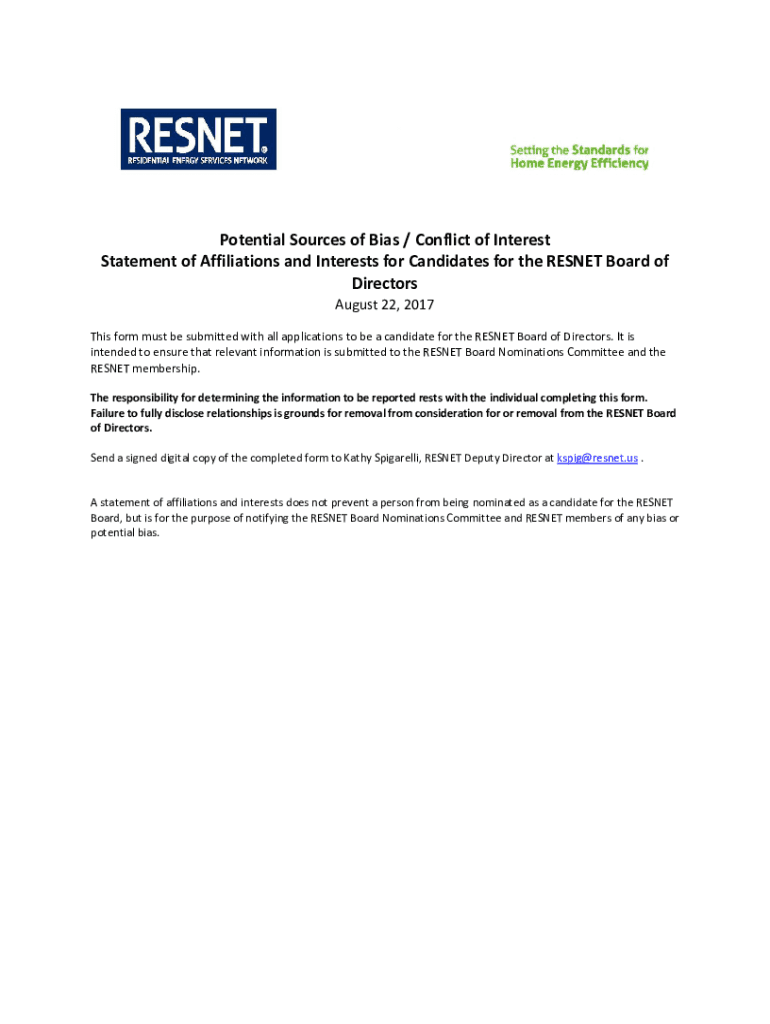 Potential Sources of Bias / Conflict of Interest Statement of Affiliations and Interests in Candidates for the RESET Board of Directors August 22, 2017This form must be submitted with all applications