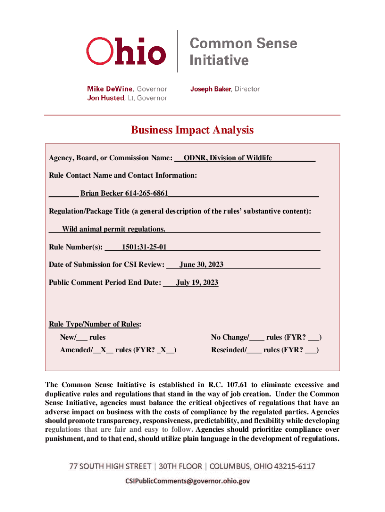 Business Impact Analysis Agency, Board, or Commission Name: __ ODOR, Division of Wildlife ___ Rule Contact Name and Contact Information: ___ Brian Becker 6142656861___ Regulation/Package Title (a