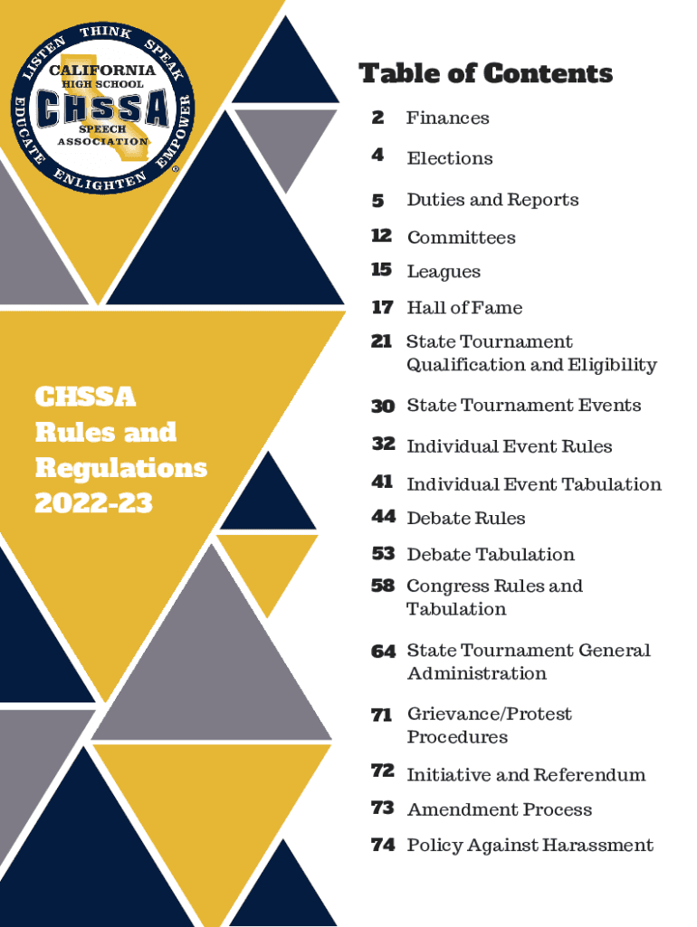 Table of Contents 2Finances4Elections5Duties and Reports12 Committees 15 Leagues 17 Hall of Fame 21 State Tournament Qualification and EligibilityCHSSA Rules and Regulations 20222330 State Tournament