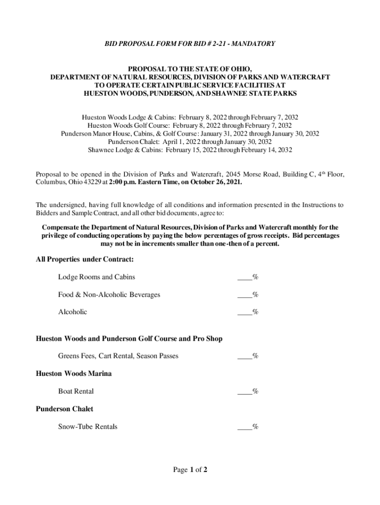 BID PROPOSAL FORM FOR BID # 221 MANDATORYPROPOSAL TO THE STATE OF OHIO, DEPARTMENT OF NATURAL RESOURCES, DIVISION OF PARKS AND WATERCRAFT TO OPERATE CERTAIN PUBLIC SERVICE FACILITIES AT HUSTON WOODS,