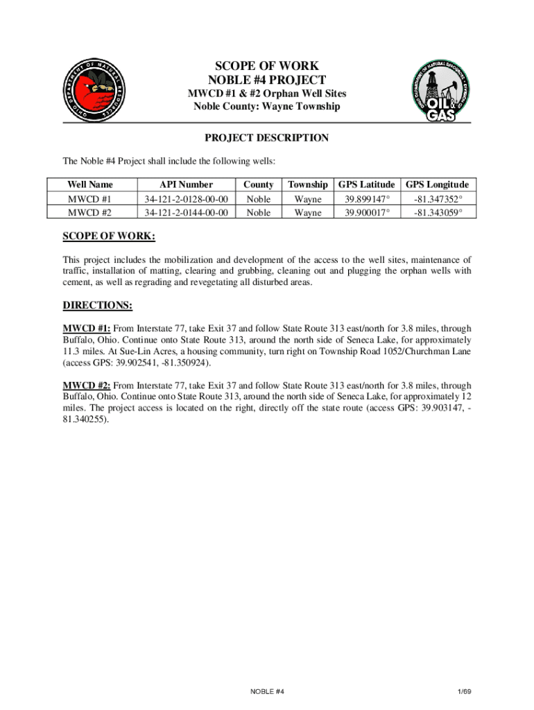 SCOPE OF WORK NOBLE #4 PROJECT MCD #1 & #2 Orphan Well Sites Noble County: Wayne Township PROJECT DESCRIPTION The Noble #4 Project shall include the following wells: Well Name API NumberCountyTownshipGPS