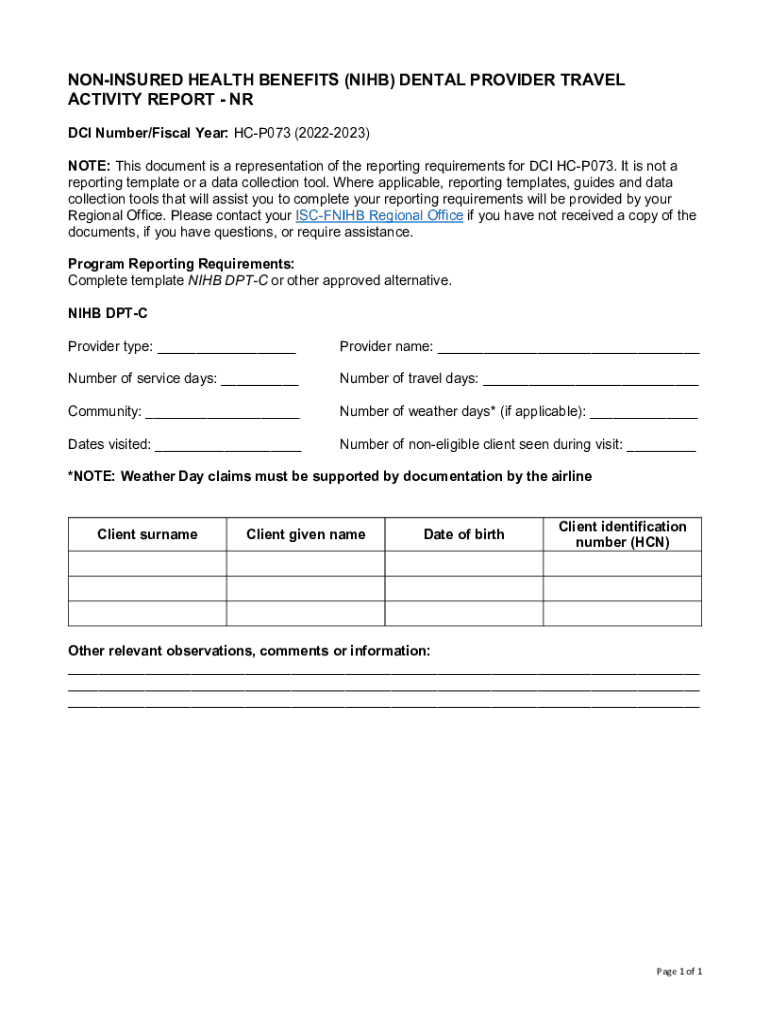 UNINSURED HEALTH BENEFITS (NIB) DENTAL PROVIDER TRAVEL ACTIVITY REPORT NR DCI Number/Fiscal Year: HCP073 (20222023) NOTE: This document is a representation of the reporting requirements for DCI HCP073.