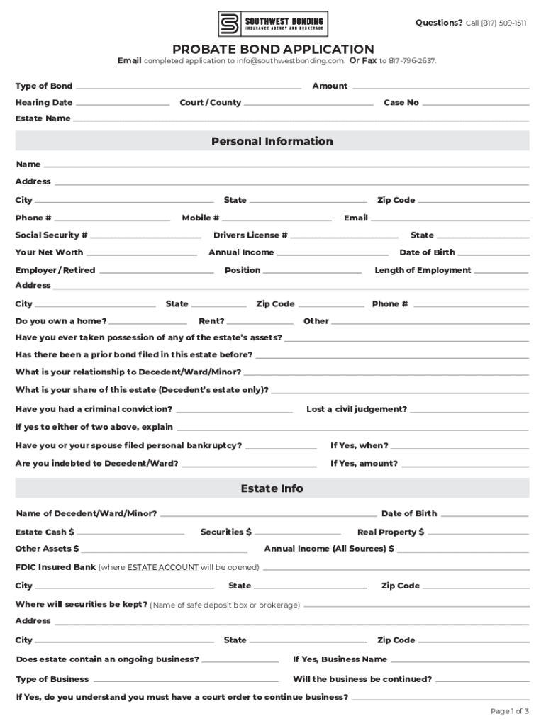 PROBATE BOND APPLICATION INSTRUCTIONSOption 1 Email or Probate Bonds IncludeComplete all pages of the application. ExecutorsEmail completed application to: info@southwestbonding.com Administrators