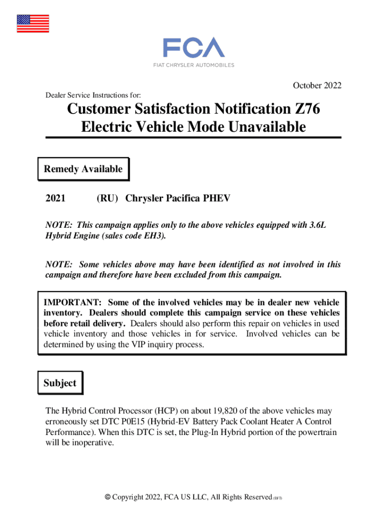 October 2022 Dealer Service Instructions for:Customer Satisfaction Notification Z76 Electric Vehicle Mode Unavailable Remedy Available 2021(RU) Chrysler Pacifica DENOTE: This campaign applies only
