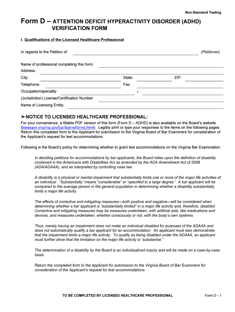 Nonstandard Testing Form D ATTENTION DEFICIT HYPERACTIVITY DISORDER (ADHD) VERIFICATION FORM I. Qualifications of the Licensed Healthcare Professional In regard to the Petition of (Petitioner) Name
