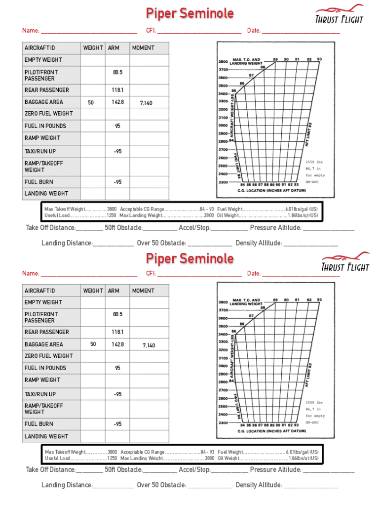 Piper Seminole Name: ___ AIRCRAFT IDWEIGHTARMCFI: ___ Date: ___MOMENTEMPTY WEIGHT PILOT/FRONT PASSENGER80.5REAR PASSENGER118.1BAGGAGE AREA507,140142.8ZERO FUEL WEIGHT FUEL IN POUNDS95RAMP WEIGHT TAXI/RUN