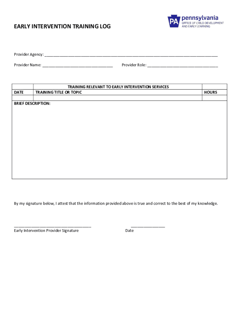 EARLY INTERVENTION TRAINING Pennsylvania OFFICE CHILODEVELOPMENT ANO EARLYLEARMNGProvider Agency: ___ Provider Name: ___DATEProvider Role: ___TRAINING RELEVANT TO EARLY INTERVENTION SERVICES TRAINING