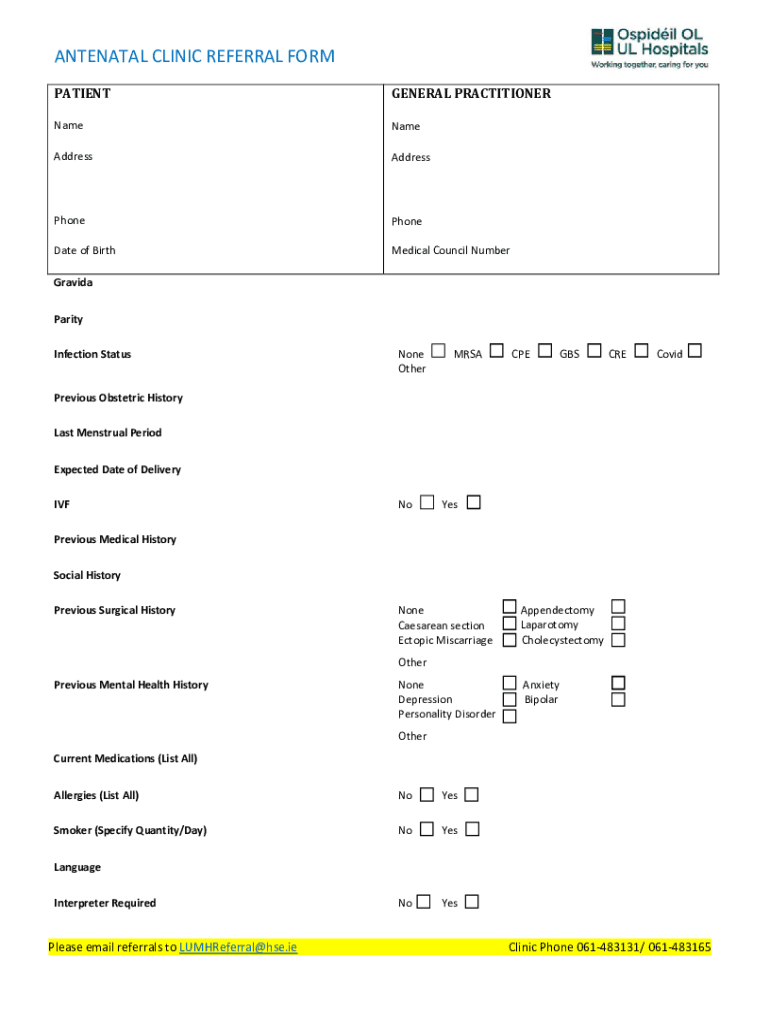 ANTENATALCLINICREFERRALFORM PATIENTGENERAL PRACTITIONERNameNameAddressAddressPhonePhoneDateofBirthMedicalCouncilNumberGravida Parity InfectionStatusNone OtherMRSACPEGBSCRECovidPreviousObstetricHistory