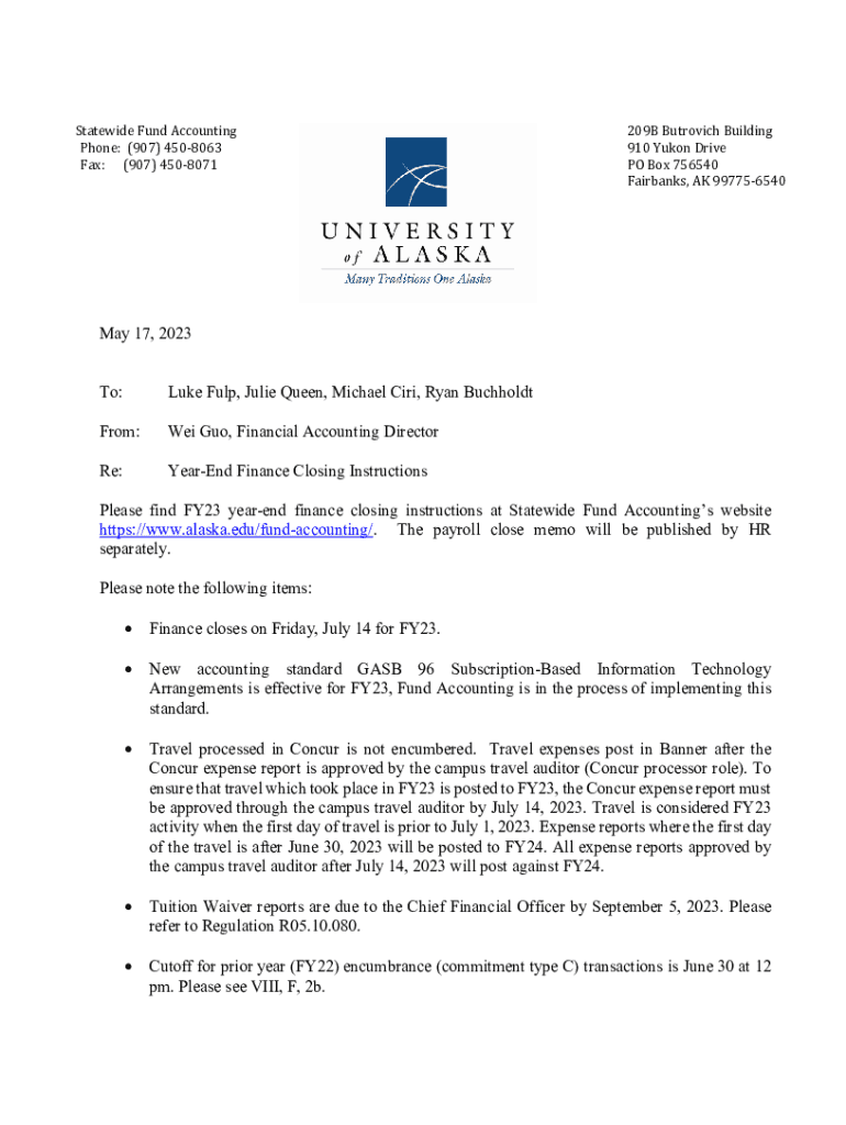 Statewide Fund Accounting Phone: (907) 4508063 Fax: (907) 4508071209B Petrovich Building 910 Yukon Drive PO Box 756540 Fairbanks, AK 997756540May 17, 2023 To:Luke Full, Julie Queen, Michael Cirri,
