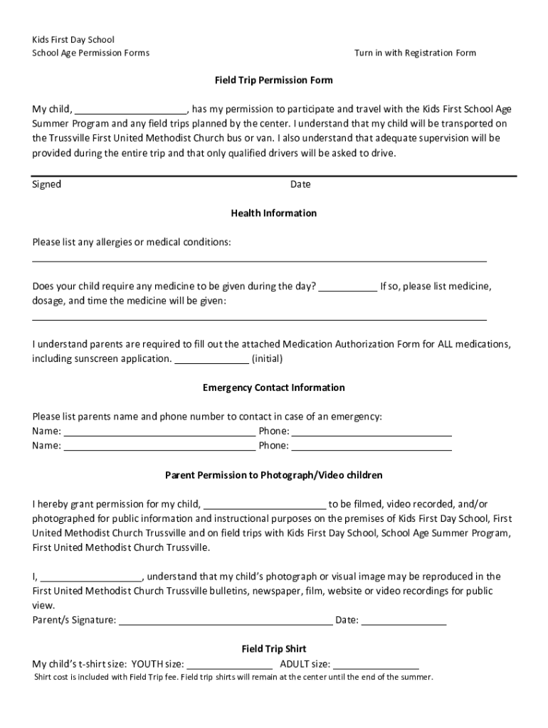Kids First Day School Age Permission Formation in with Registration Cornfield Trip Permission Form My child, ___, has my permission to participate and travel with the Kids First School Age Summer