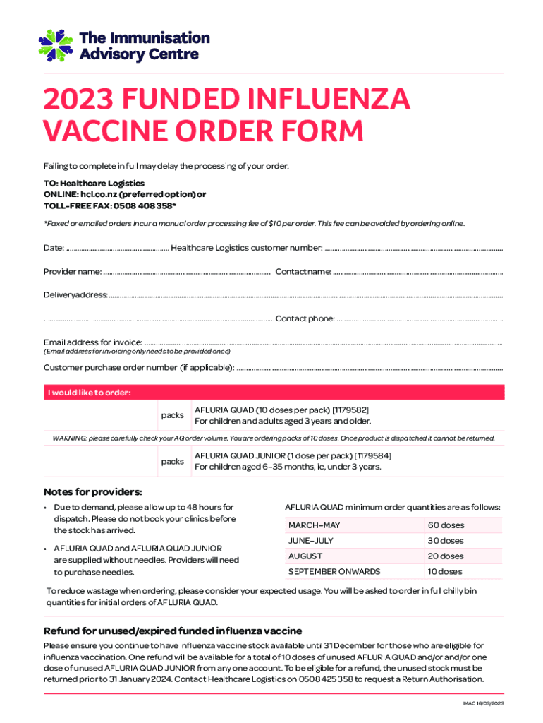 2023 FUNDED INFLUENZA VACCINE ORDER FORM a Filing to complete in full may delay the processing of o y your order. TO: Healthcare Logistics ONLINE: HCL.co.NZ (preferred option) or TOLL-FREE FAX: 0508