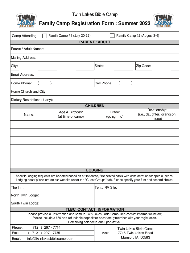 Twin Lakes Bible Campanile Camp Registration Form : Summer 2023 Camp Attending:Family Camp #1 (July 2022)Family Camp #2 (August 36)PARENT / ADULT Parent / Adult Names: Mailing Address: City:State:Zip