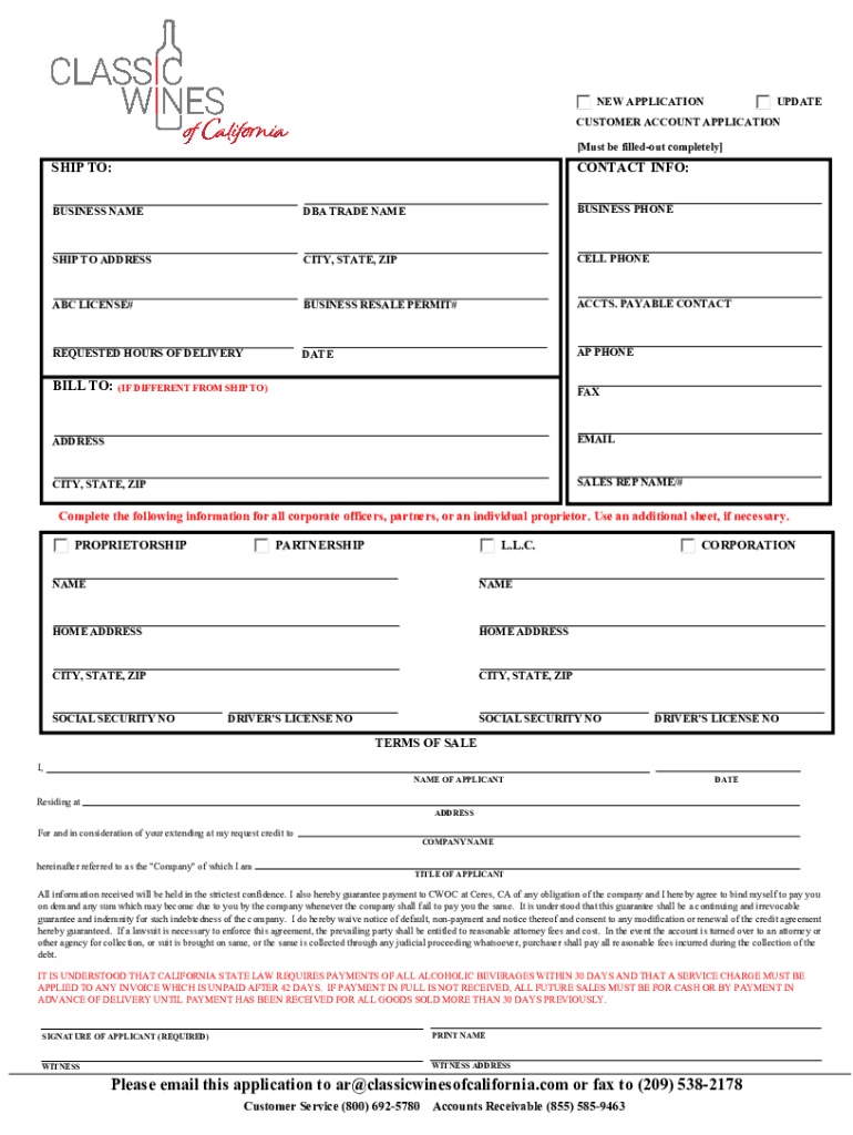 Print Reset Application NEW APPLICATIONUPDATECUSTOMER ACCOUNT APPLICATION [Must be filled out completely]SHIP TO:CONTACT INFO:BUSINESS NAME DBA TRADE NAMEBUSINESS PHONES HIP TO ADDRESSING, STATE,