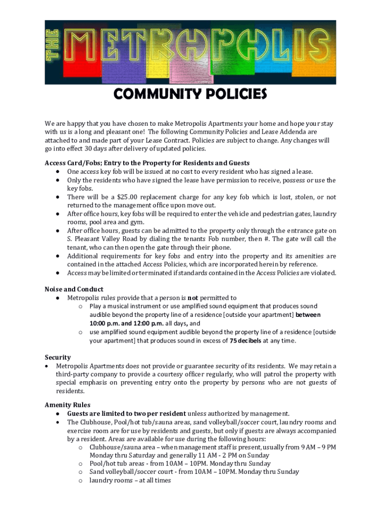 COMMUNITY POLICIES We are happy that you have chosen to make Metropolis Apartments your home and hope your stay with us is a long and pleasant one! The following Community Policies and Lease Addenda
