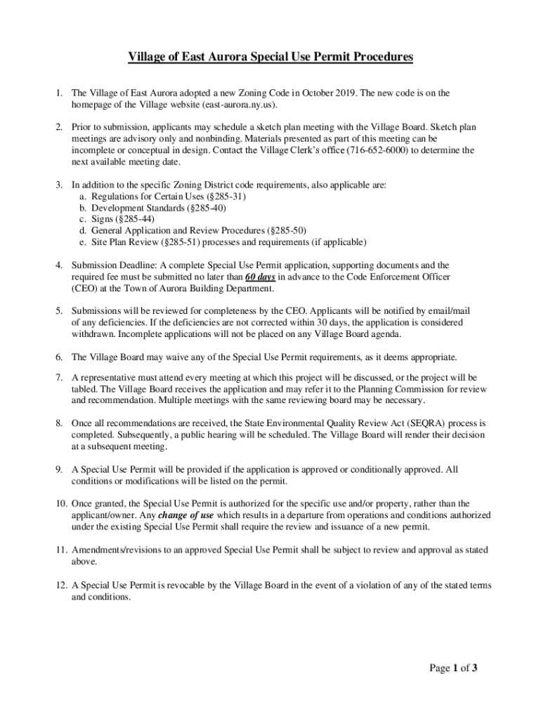 Village of East Aurora Special Use Permit Procedures 1. The Village of East Aurora adopted a new Zoning Code in October 2019. The new code is on the homepage of the Village website (east aurora.NY.us).