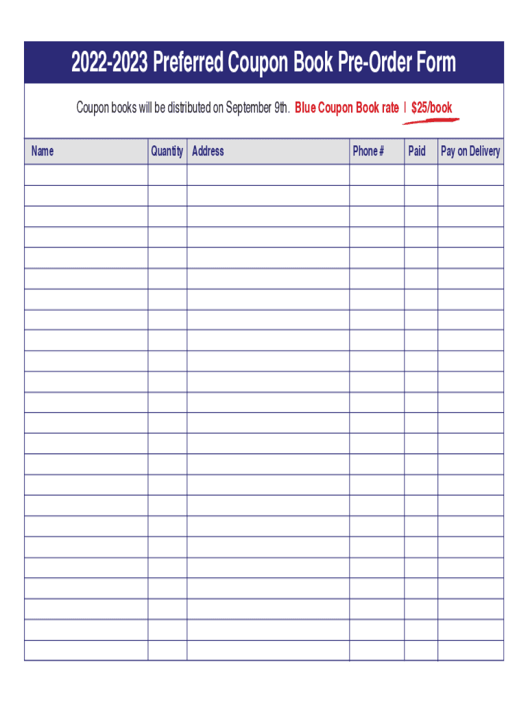 20222023 Preferred Coupon Book PreOrder Form Coupon books will be distributed on September 9th. Blue Coupon Book rate | $25/book NameQuantityAddressPhone #Payday on Delivery.