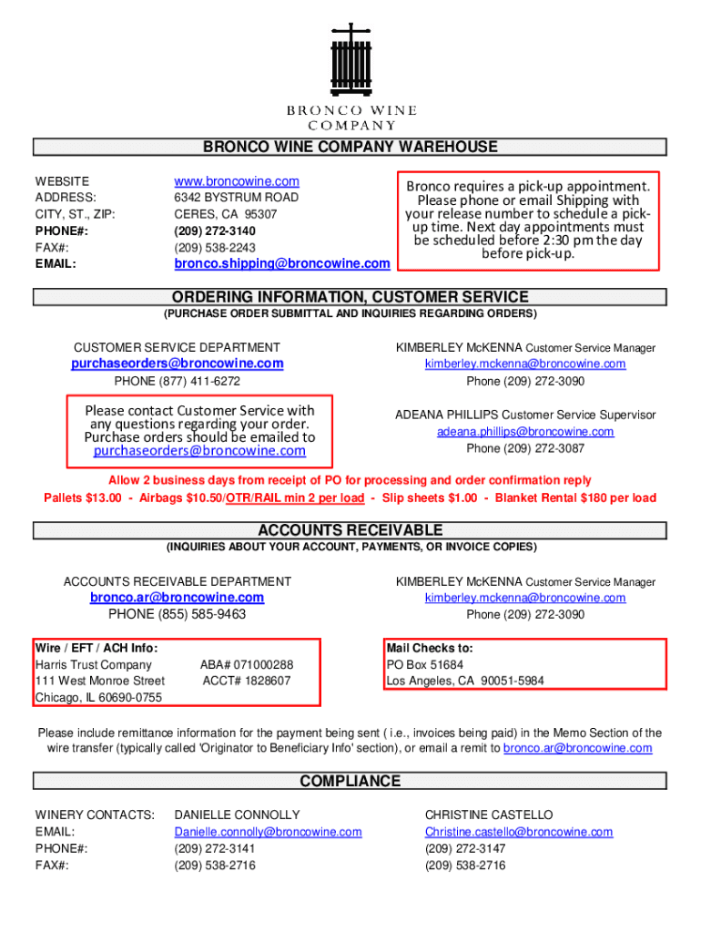 BRONCO WINE COMPANY WAREHOUSE Bronco requires a pickup appointment. Please phone or email Shipping with your release number to schedule a pickup time. Next day appointments must be scheduled before