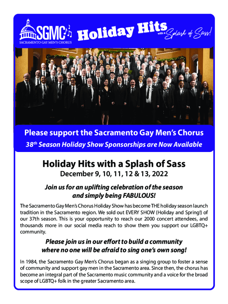 Please support the Sacramento Gay Men Chorus 38th Season Holiday Show Sponsorships are Now Available Holiday Hits with a Splash of Sass December 9, 10, 11, 12 & 13, 2022Join us for an uplifting celebration