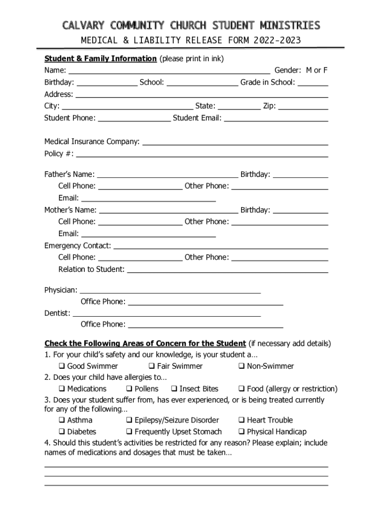 CALVARY COMMUNITY CHURCH STUDENT MINISTRIES MEDICAL & LIABILITY RELEASE FORM 20222023 Student & Family Information (please print in ink) Name:Gender: M or Birthday:School:Grade in School:Address: