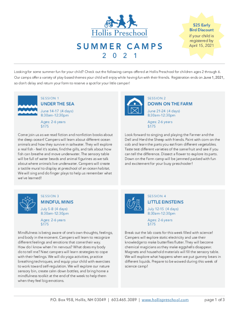 SUMMER CAMPS$25 Early Bird Discount if your child is registered by April 15, 20212 0 2 1Looking for some summer fun for your child? Check out the following camps offered at Hollis Preschool for children