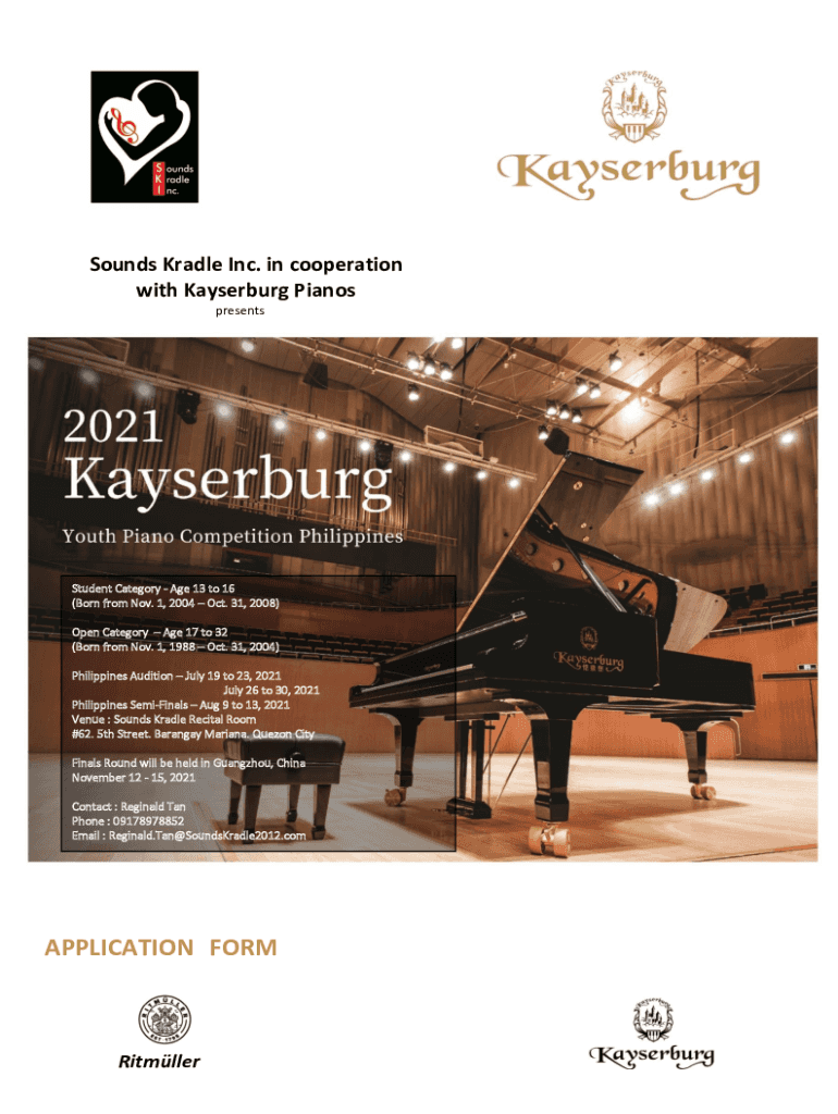 Sounds Cradle Inc. in cooperation with Kayserburg Pianos presentsStudent Category Age 13 to 16 (Born from Nov. 1, 2004 Oct. 31, 2008) Open Category Age 17 to 32 (Born from Nov. 1, 1988 Oct. 31, 2004)
