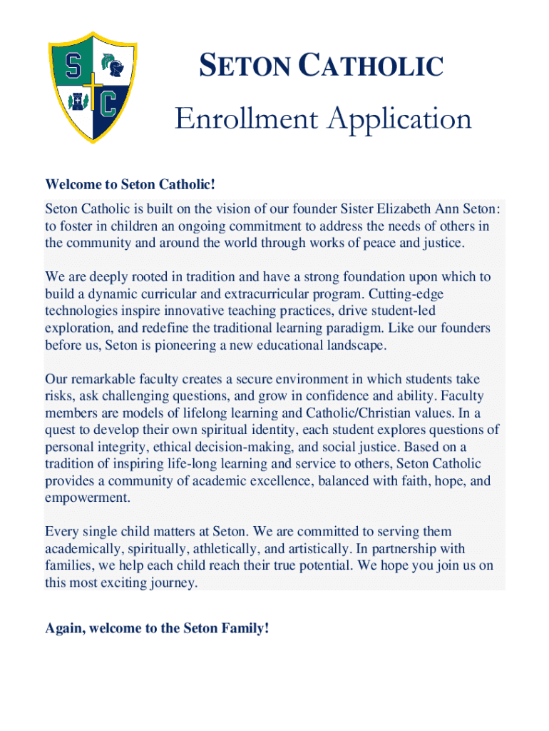 SETON CATHOLIC Enrollment Application Welcome to Seton Catholic! Seton Catholic is built on the vision of our founder Sister Elizabeth Ann Seton: to foster in children an ongoing commitment to address