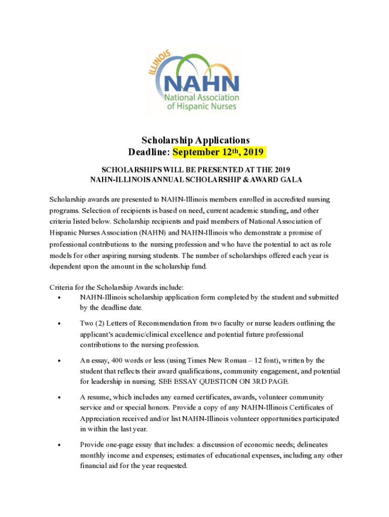 ! Scholarship Applications Deadline: September 12th, 2019 SCHOLARSHIPS WILL BE PRESENTED AT THE 2019 NAHNILLINOIS ANNUAL SCHOLARSHIP & AWARD GALA Scholarship awards are presented to NAHNIllinois members