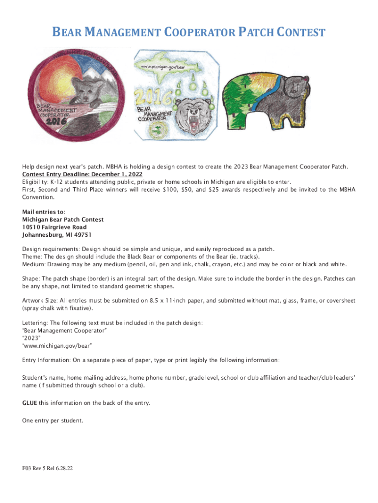 BEAR MANAGEMENT COOPERATOR PATCH Contested design next year's patch. MBA is holding a design contest to create the 2023 Bear Management Cooperator Patch. Contest Entry Deadline: December 1, 2022,