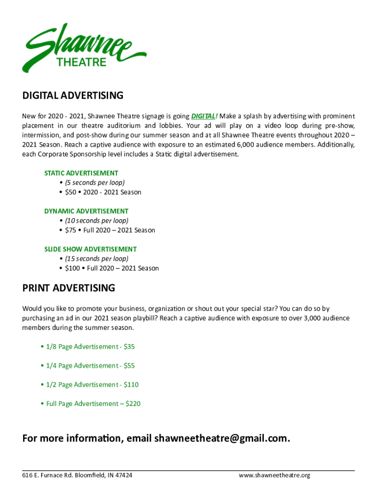 DIGITAL ADVERTISING New for 2020 2021, Shawnee Theater signage is going DIGITAL! Make a splash by adverting with prominent placement in our theater auditorium and lobbies. Your ad will play on a video
