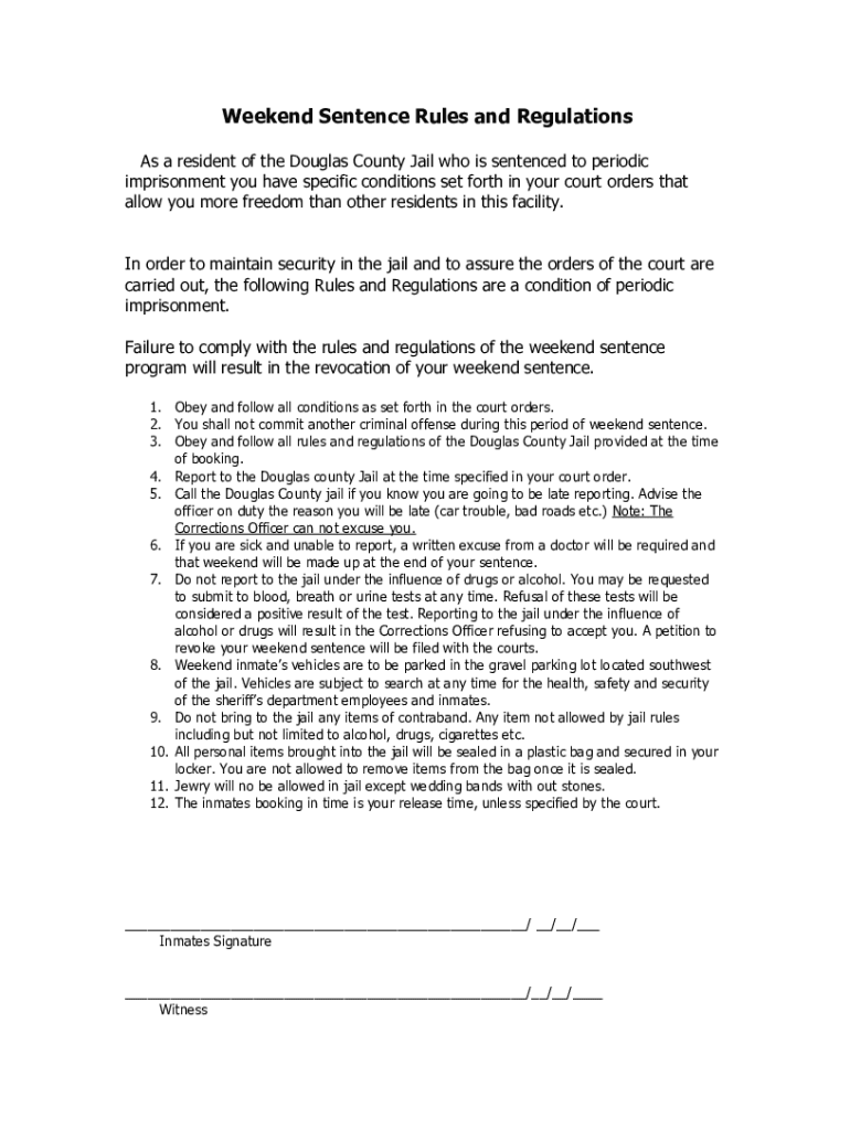 Weekend Sentence Rules and Regulations As a resident of the Douglas County Jail who is sentenced to periodic imprisonment you have specific conditions set forth in your court orders that allow you