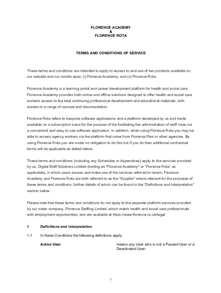 FLORENCE ACADEMY & FLORENCE ROTATE RMS AND CONDITIONS OF Serviettes terms and conditions are intended to apply to access to and use of two products available on our website and our mobile apps; (i)
