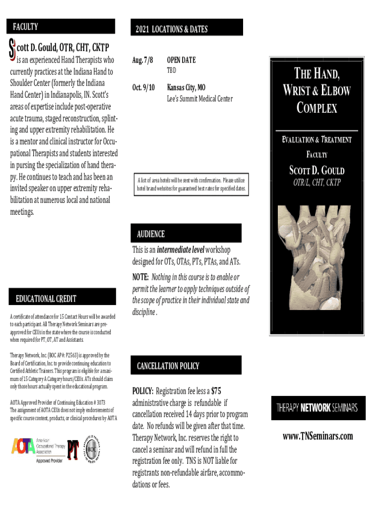 FACULTY2021 LOCATIONS & DATE Scott D. Gould, OR, CHT, CTP is an experienced Hand Therapists who currently practices at the Indiana Hand to Shoulder Center (formerly the Indiana Hand Center) in Indianapolis,