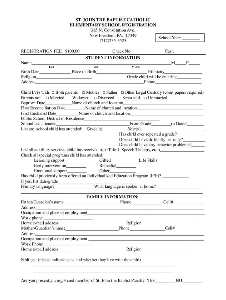 ST. JOHN THE BAPTIST CATHOLIC ELEMENTARY SCHOOL REGISTRATION 315 N. Constitution Ave. New Freedom, PA. 17349 School Year: ___ (717)2353525 REGISTRATION FEE: $100.00Check No.___Cash___ STUDENT INFORMATION
