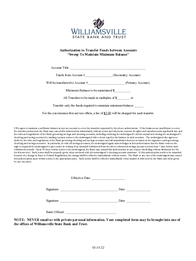 Authorization to Transfer Funds between Accounts Sweep To Maintain Minimum BalanceAccount Title: ___ Funds from Account #___ (Secondary Account) Will be transferred to Account #___ (Primary Account).