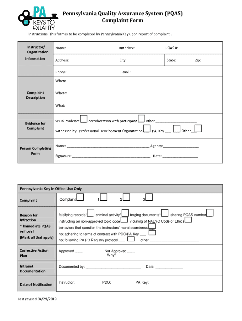 Instructions: This form is to be completed by Pennsylvania Key upon report of complaint.