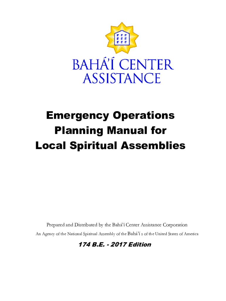 Emergency Operations Planning Manual for Local Spiritual AssembliesPrepared and Distributed by the Bah Center Assistance Corporation An Agency of the National Spiritual Assembly of the Bah s of the