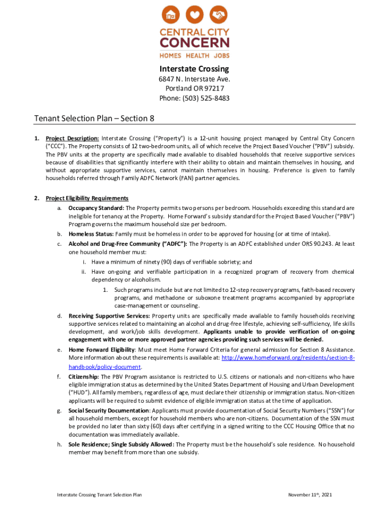 Interstate Crossing 6847 N. Interstate Ave. Portland OR 97217 Phone: (503) 5258483Tenant Selection Plan Section 8 1. Project Description: Interstate Crossing (Property) is a 12unit housing project
