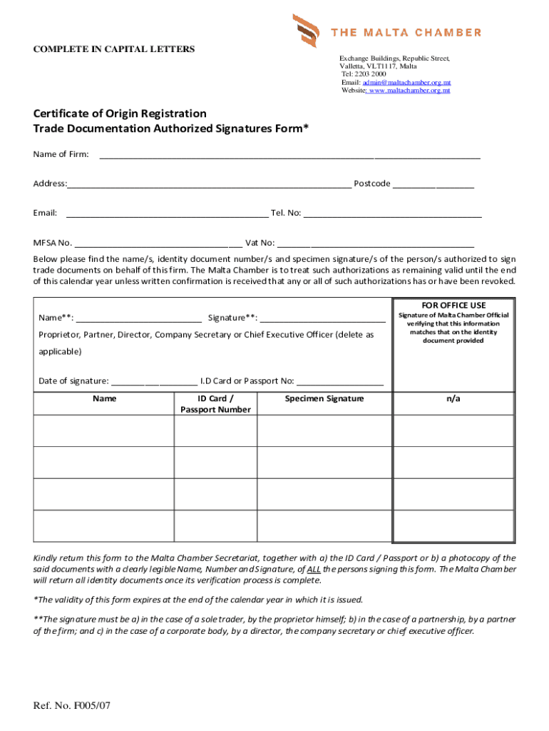 COMPLETE IN CAPITAL LETTERS Exchange Buildings, Republic Street, Valletta, VLT1117, Malta Tel: 2203 2000 Email: admin@maltachamber.org.mt Website: www.maltachamber.org.mtCertificate of Origin Registration